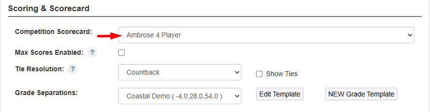 The physical scorecard template selected would match the Competition type selected as per the example below (e.g. Ambrose 4-Player)