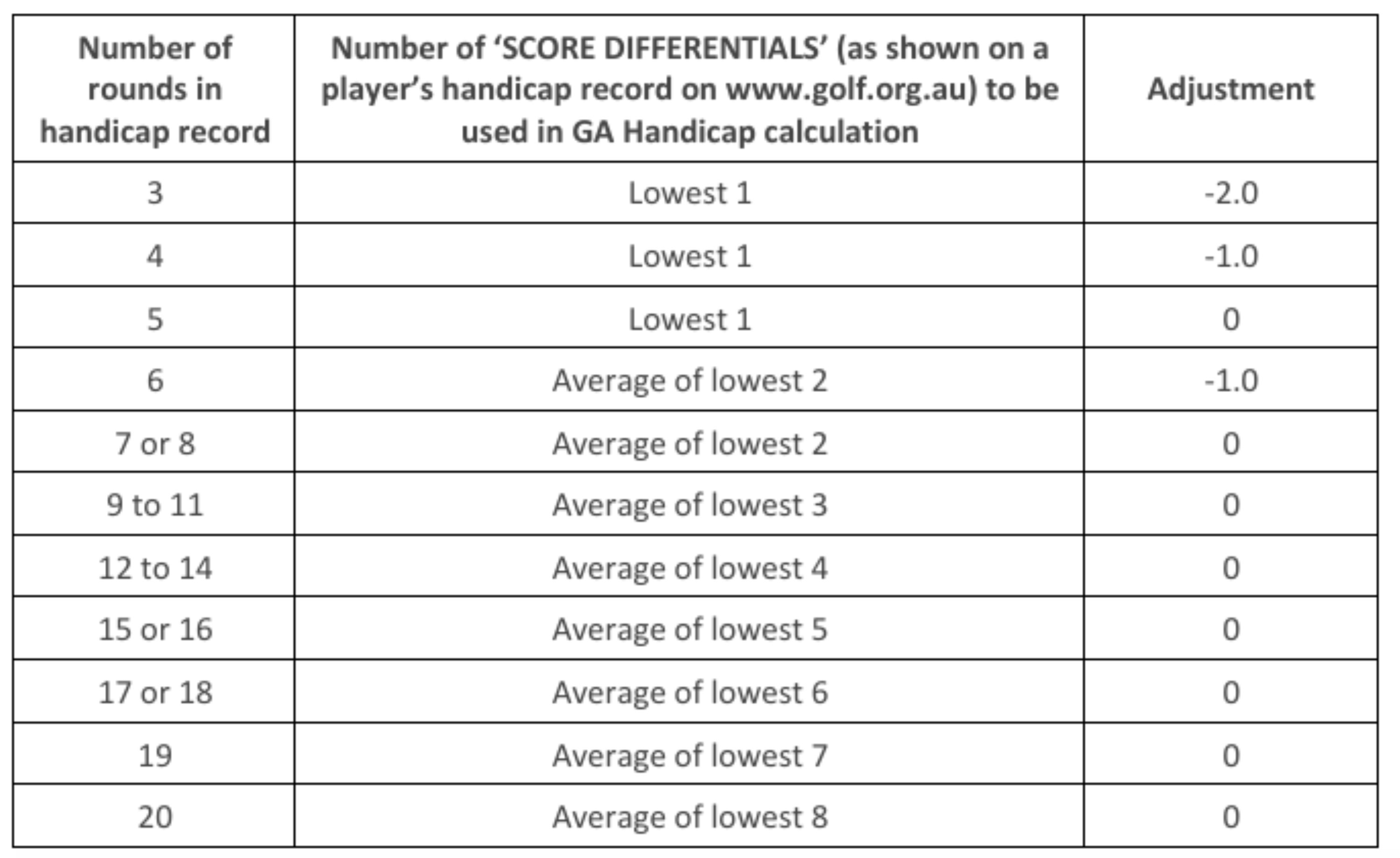Below is the calculation method used by Golf Australia for initial handicaps and player score records with less than 20 scores added. Any questions or queries about the calculation method should be directed to Golf Australia's help team.