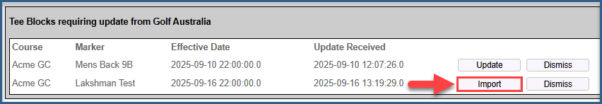 Courses shown in the list with the Import option are temp courses & new courses which have been submitted in Golf Australia CONNECT.