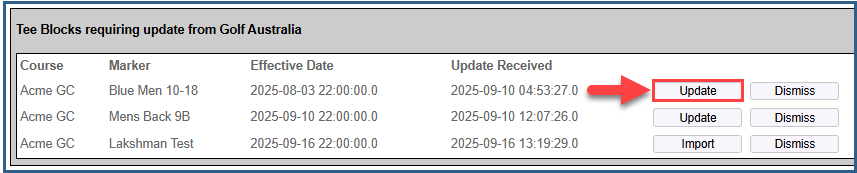 Courses shown in the list with the Update option are existing courses in the MiClub/OneGolf system which have had updates made in Golf Australia CONNECT.