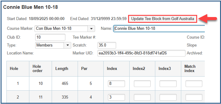 To finalise the changes select Update Tee Block from Golf Australia